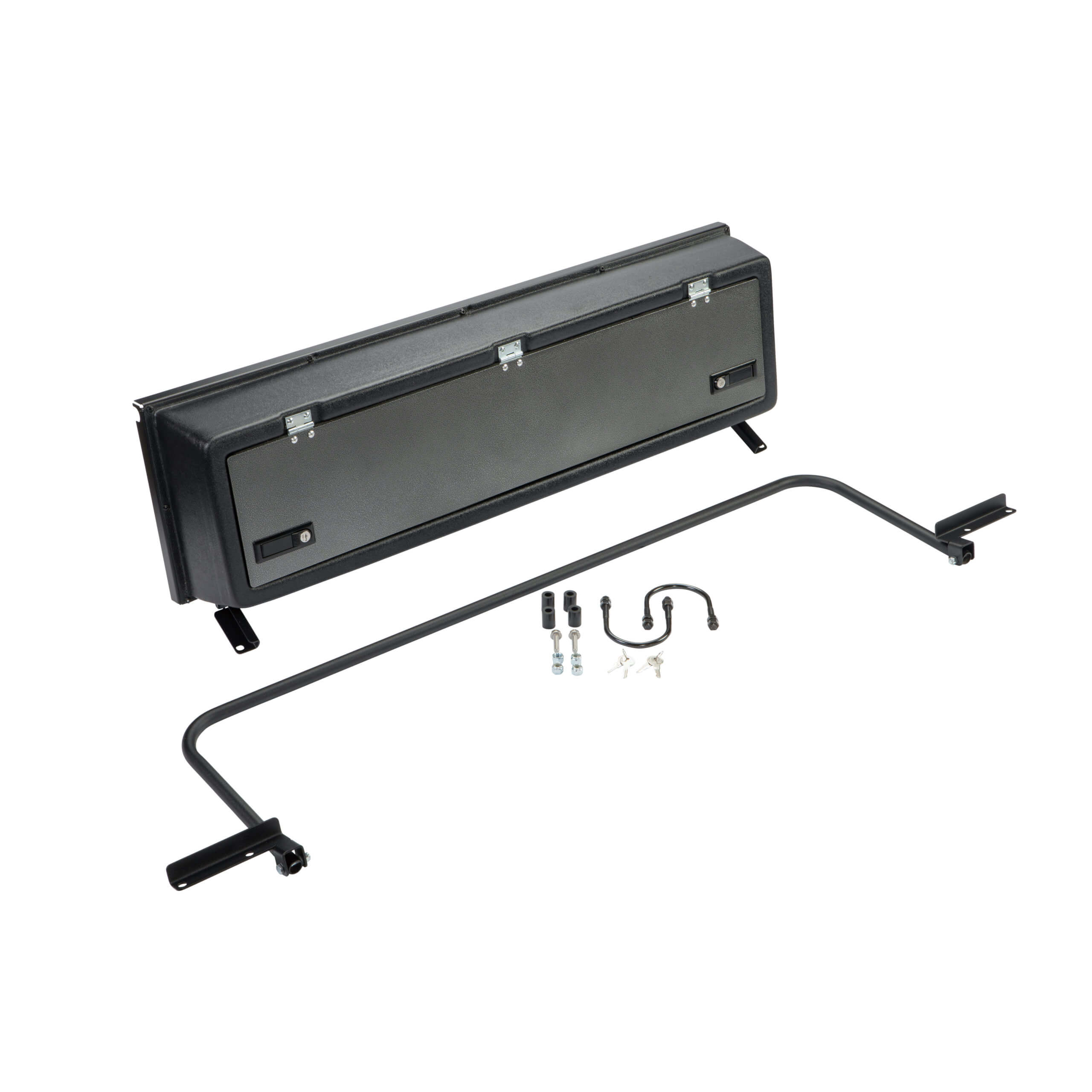 The Overhead Storage Lock Box provides a secure and convenient storage solution for 4-door hard top Jeep JK Wranglers. It mounts above the roll bars to keep recovery gear, tools, and valuables safely out of sight while maximizing available space. The lock box features a lockable door with keys for added security and swings down for easy access when needed. Installation is simple and requires no drilling—bolting directly to the roll bars in minutes. With a 35 lb weight capacity, this lock box offers reliable storage without interfering with vehicle functionality. It is not compatible with soft top models.