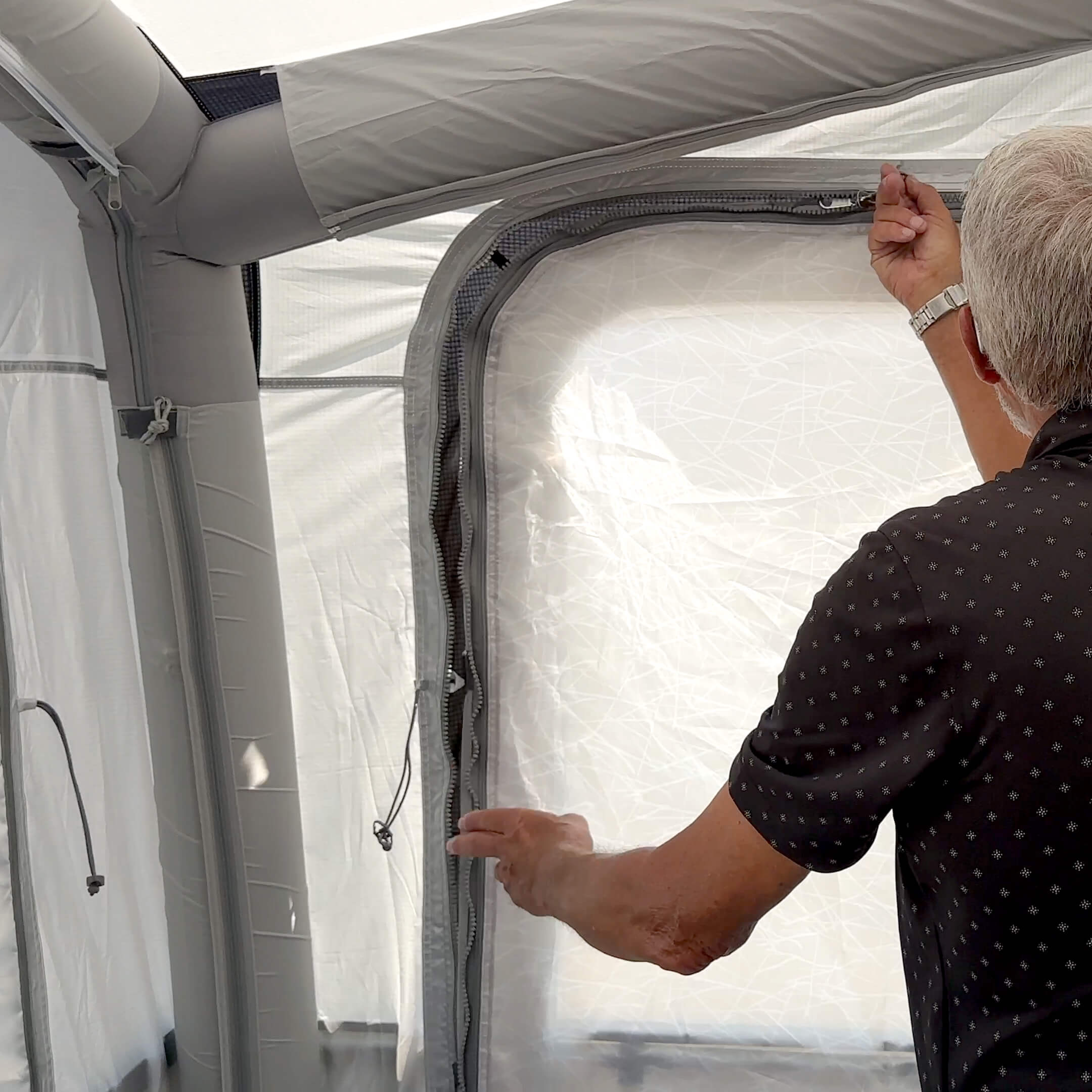 Creates privacy with adjustable, zippered panels.