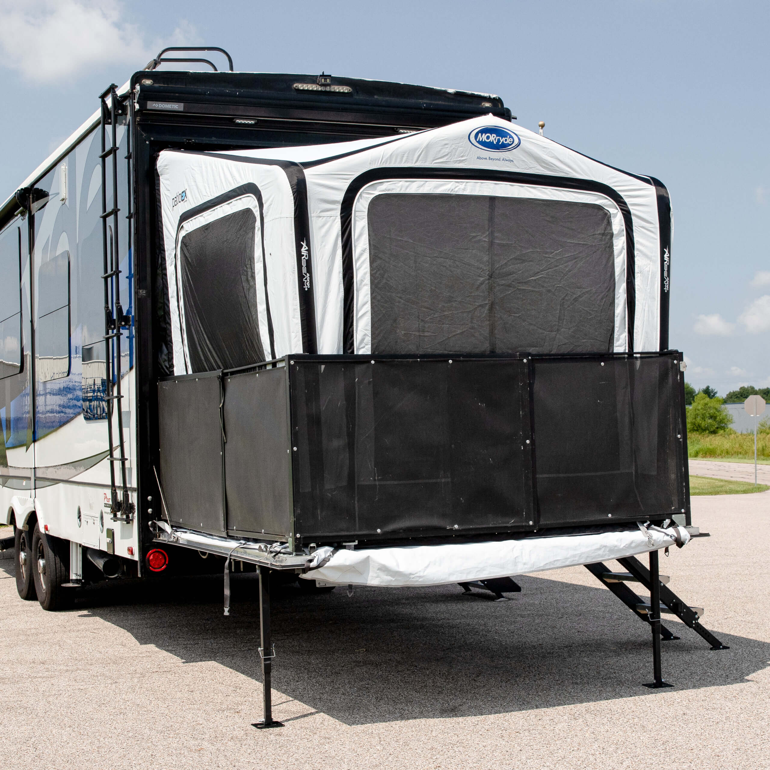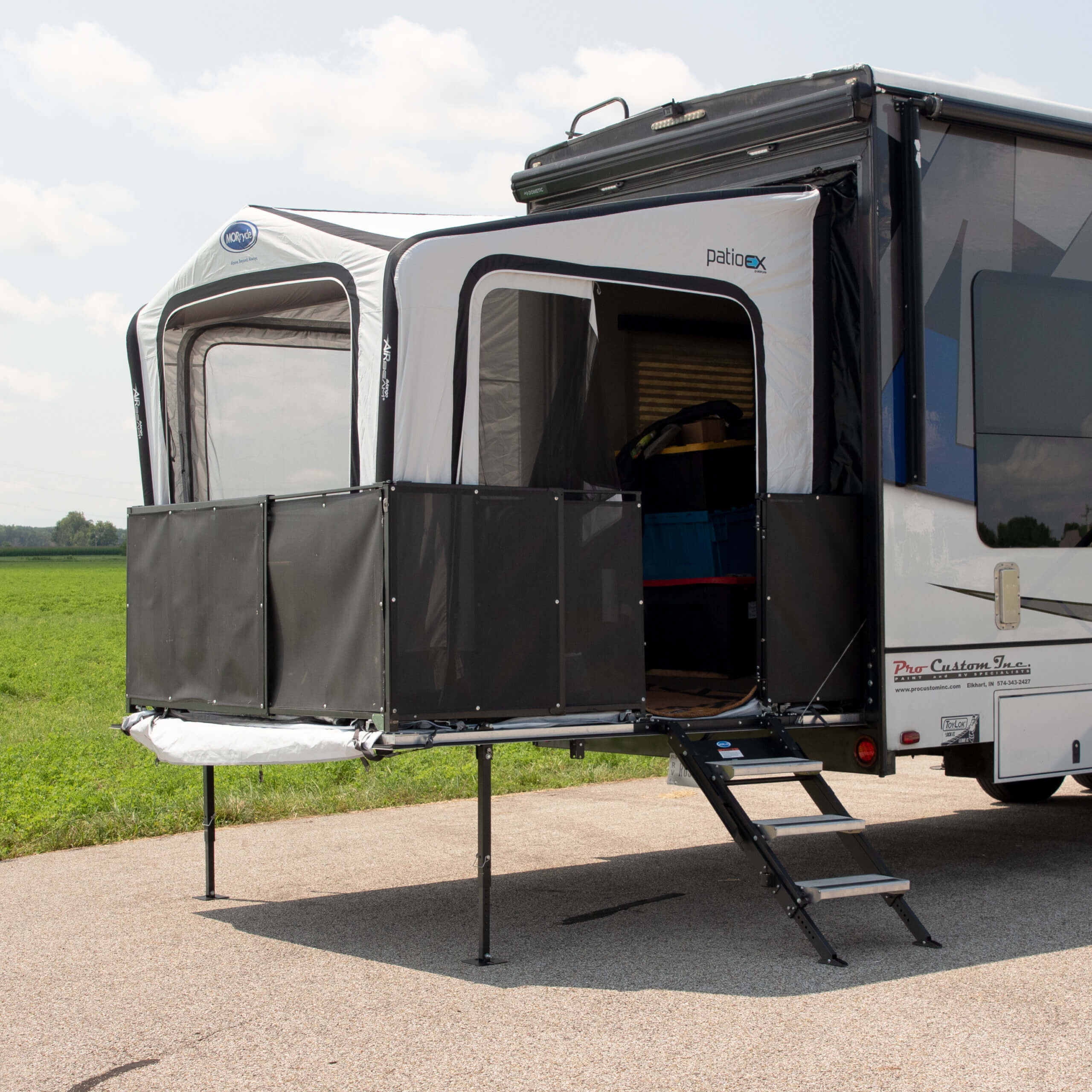 The PatioEx inflatable tent from MORryde adds comfortable living space to your toy hauler.