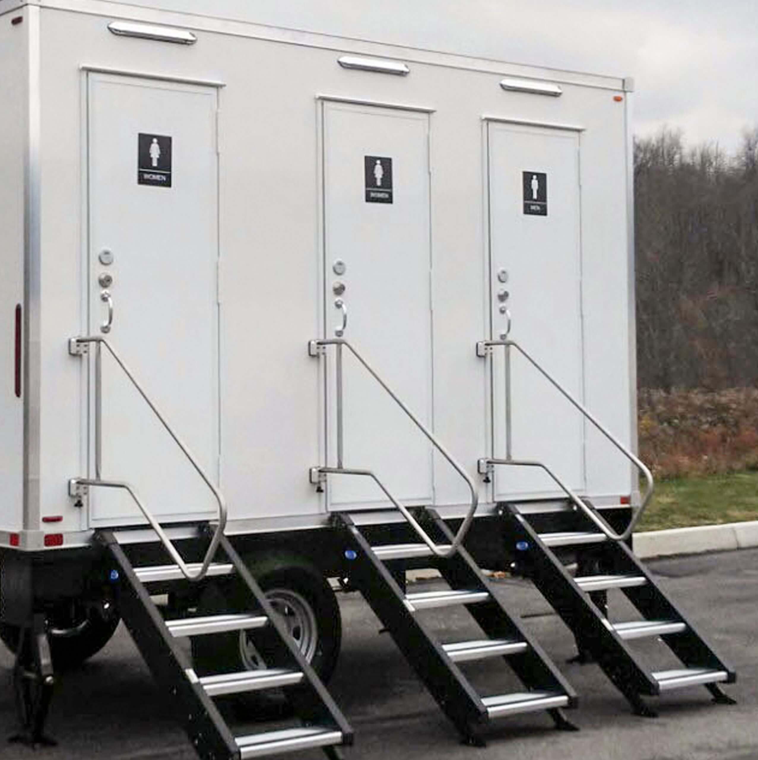 Upgrade your restroom trailer with this innovative step system that provides bounce-free, wobble-free stability. Adjustable feet secure the trailer steps to the ground, even on rough terrain. The steps store easily store inside the trailer door entrance.