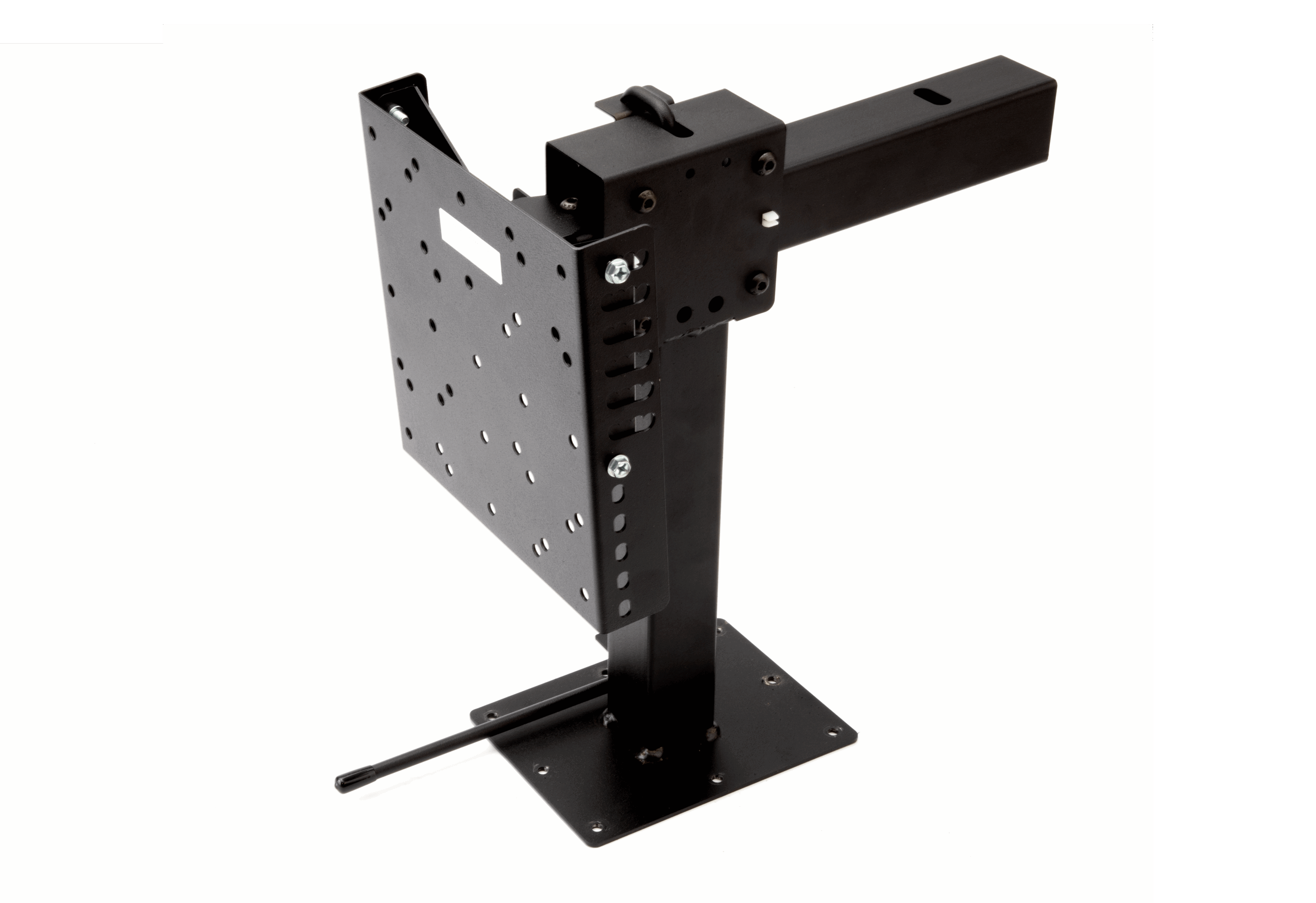 This adjustable slide out base TV mount fits perfectly in a cabinet, on a counter, desk, or any horizontal surface in your RV. This mount is excellent for under the cabinet installation or reinforced ceilings. The versatile design lets you slide out the TV, adjust the height and swivel and tilt into place. A locking mechanism keeps your TV or monitor secure in the out position or locked in for travel.