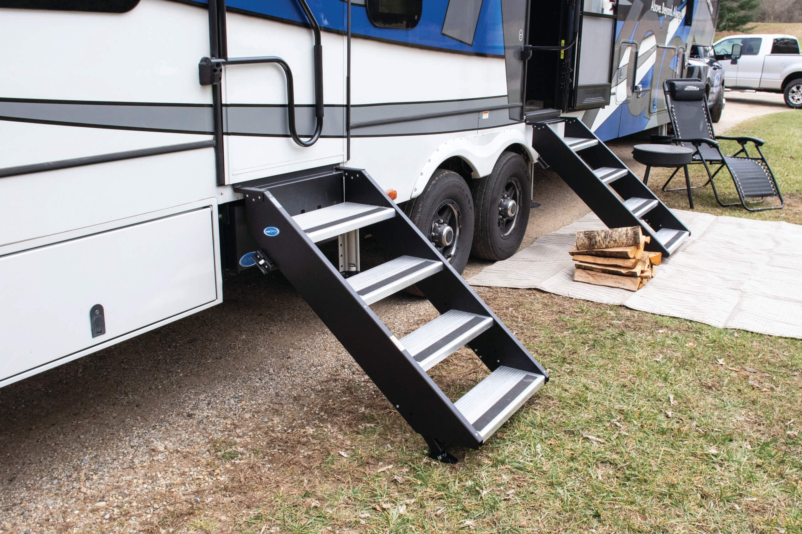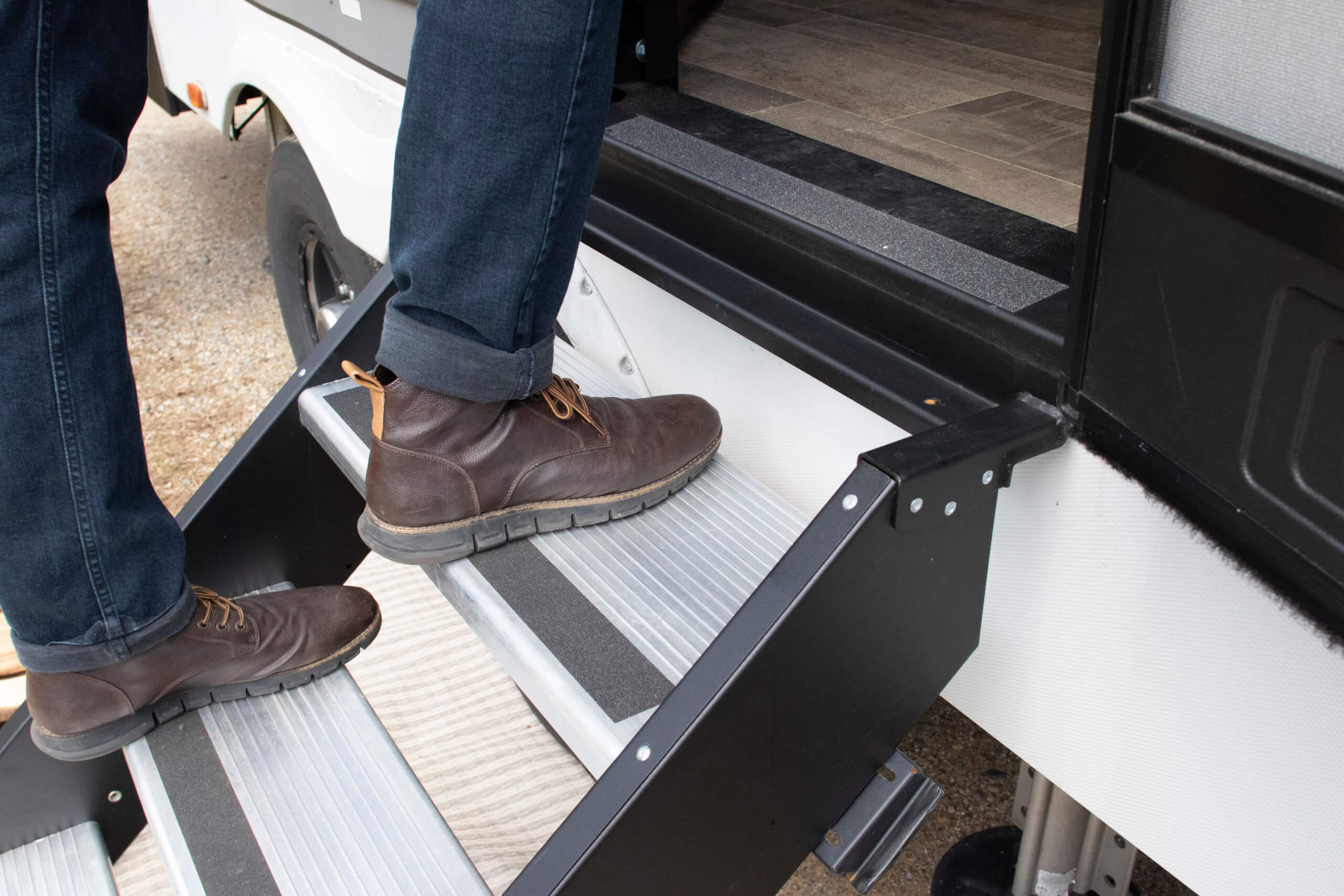 Our 2nd Generation StepAbove RV entry step system gives you more stability, security and safety as you enter and exit your RV.